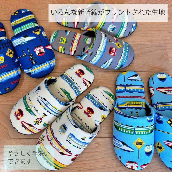 いろんな種類の新幹線がプリントされたオックス生地です。